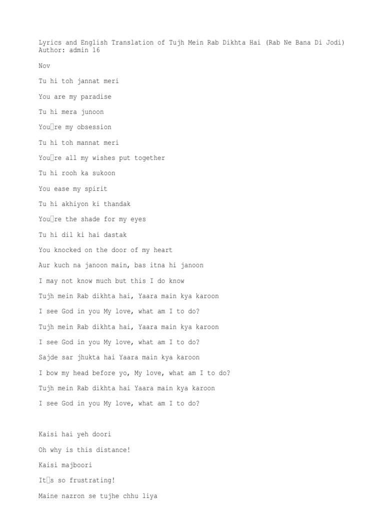 Roop Kumar Rathod Tujh Mein Rab Dikhta Hai Lyrics English Roop Kumar Rathod Tujh Mein Rab Dikhta Hai Lyrics English - Tujh mein rab dikhta hai.